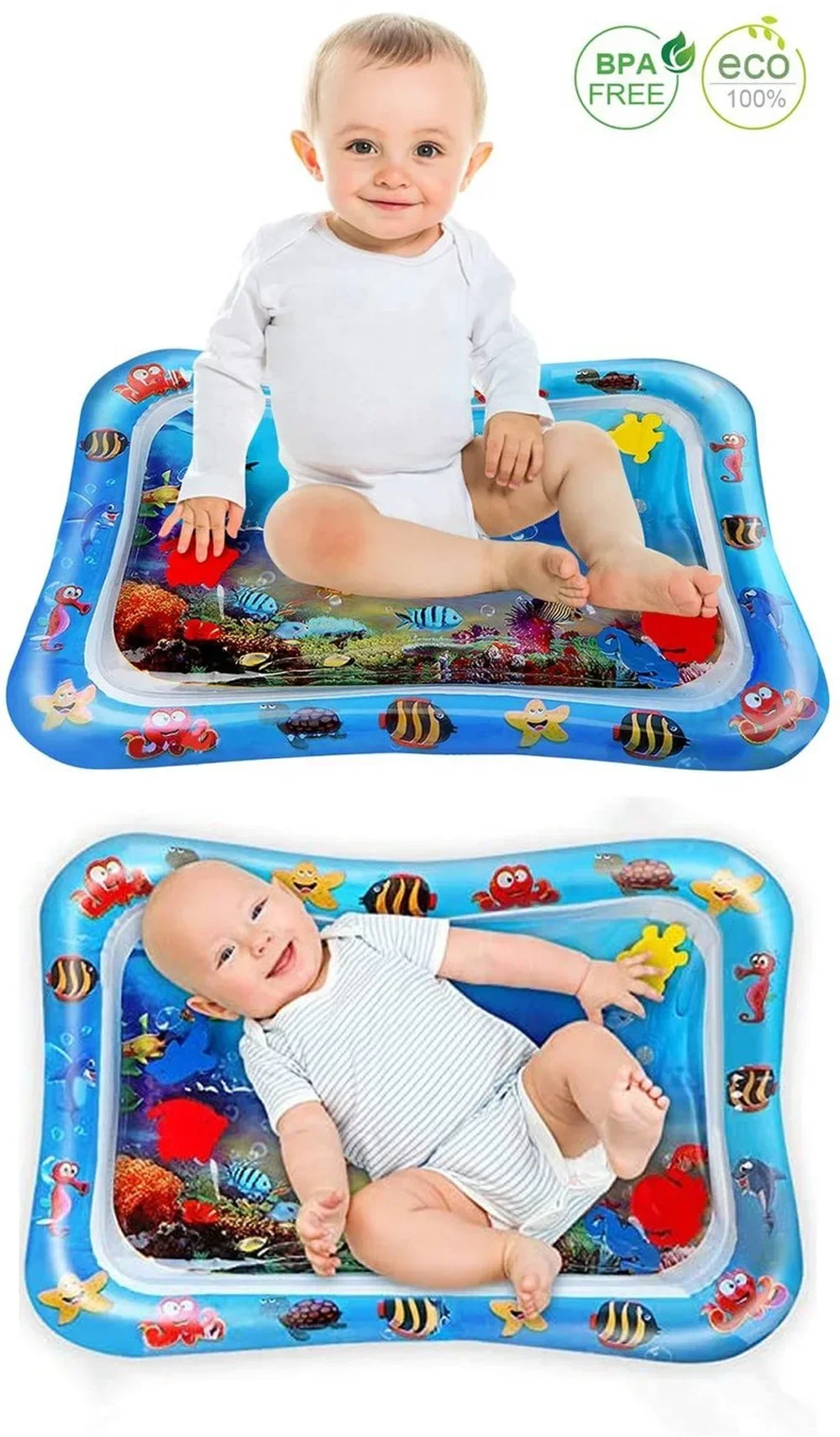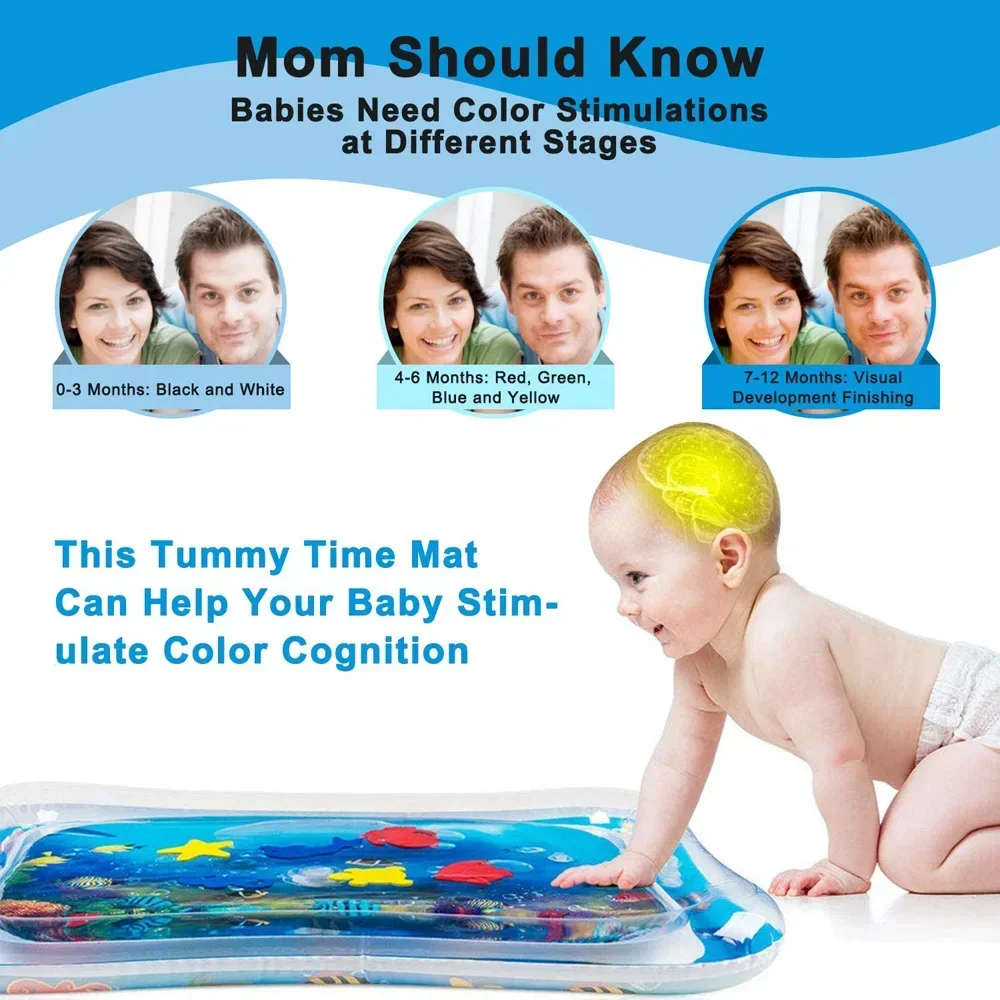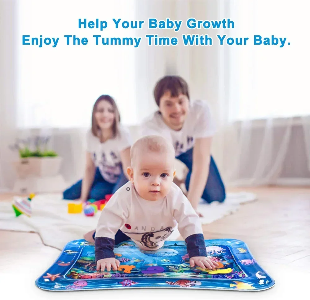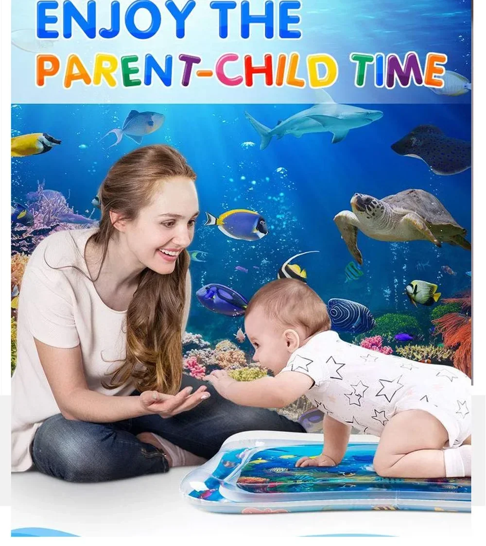 Tummy time activity center helps strengthen baby's back, legs, arms and neck. Kids water play mat constructed from thicken PVC will not leak air or water. Baby presses the water mat and moves fish around, to promote hand-eye coordination. Tummy time mat is great for sensory stimulation, motor skills, cognitive abilities, and social skills. Simply fill the mat with water and inflate the edge with air, kids can have hours of tactile and visual fun.